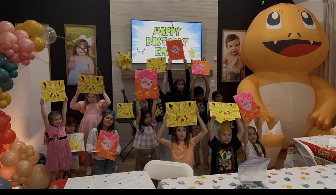 Each party includes 2 professional instructors, all art supplies (paint, brushes, aprons, canvases), setup and cleanup, and your chosen painting design. Add-ons, such as custom artwork or extra time, can be purchased for an additional fee. Parties are 1.5 hours.