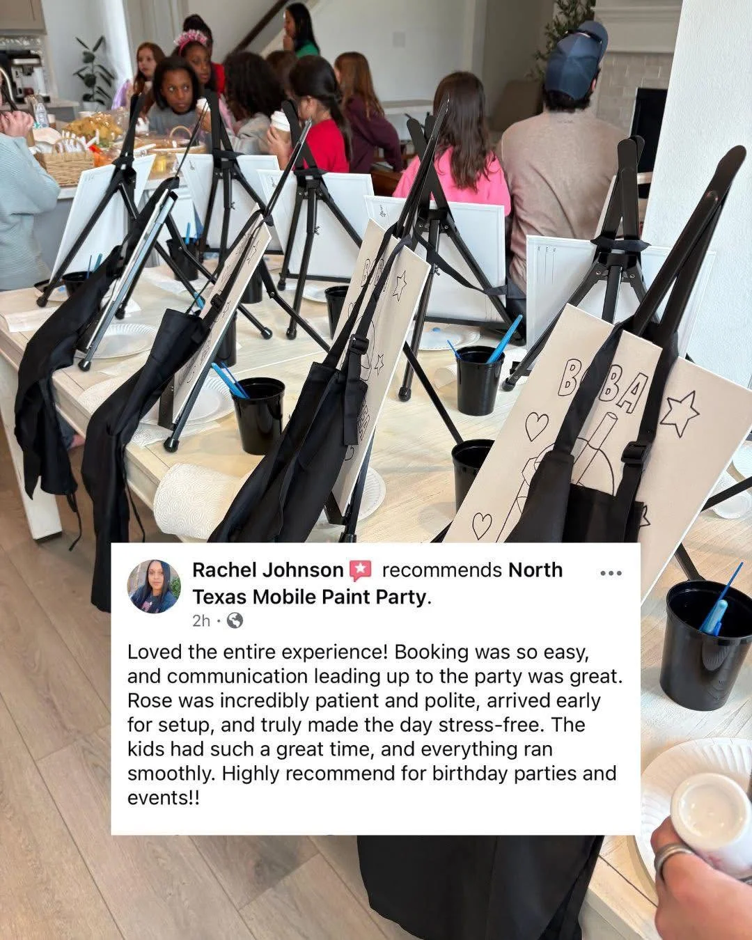 Each party includes 2 expert instructors, an 11x14 traced canvas for each painter, paint, aprons, and other supplies to create a memorable event!